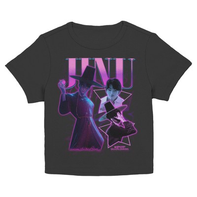 We're going up, up, up, and these trendy designs from the new animated film K-Pop Demon Hunters won't stay behind! Whether you're a demon hunter or a regular idol, you can't go wrong with this Men's Jinu Saja Collage Graphic T-shirt that features your favorite Saja Boy, Jinu Saja, in a cute collage framed by stars in purple shades, and the K-Pop Demon Hunters logo below. Get golden to conquer the Idol Awards and embrace your true self to show the world how it's done!