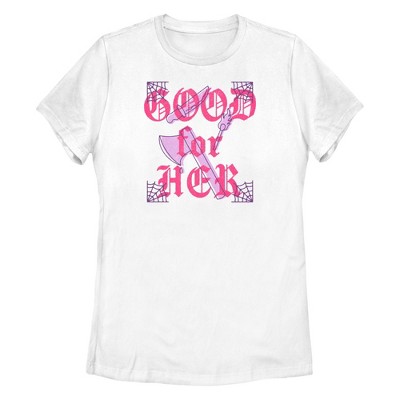 • Channel your inner final girl with this stylish new men's t-shirt that is perfect for the scariest time of the year! Featuring the phrase: "Good For Her" printed in Gothic pink font, with a knife, a match, an axe, and spider webs in matching cute style adorning the background.