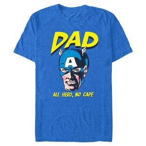 Give your Dad the best Father's Day ever this year with his favorite comic book heroes and this officially licensed graphic apparel from Marvel Comics! This super fun All Hero No Cape Men's Graphic T-Shirt features a cool portrait of Captain America with the text: "Dad All Hero No Cape" printed in themed lettering around him. It's time to get marvel-ous with awesome Marvel shirts so grab one of these cool themed pieces and celebrate your favorite superhero dad today!