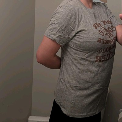 [This review was collected as part of a promotion.] I ordered this size men's large as a gift so I tried it on for the pictures. I typically wear a women's medium right now. I sometimes wear a men's small or a medium for a looser fit. This fit large on me as expected but it does seem to fit true to size. The T-shirt itself is very soft to the touch and comfortable to wear. The text on the shirt is brown and faded in some parts with is the design