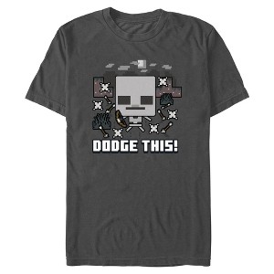 Whether you're building something amazing, battling mobs, or playing with friends, show your love for everyone's favorite game in this officially licensed Men's Minecraft Dodge Skeleton Graphic T-Shirt! This awesome design features an incredible, animated graphic of a Skeleton mob holding a bow as it escapes arrows flying at him with the phrase: "Dodge This!" printed below in themed lettering. Join all your favorite boxy characters in a world of endless possibilities with fun new graphic apparel for the whole family today!