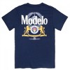 Officially licensed Modelo Logo Front Back Crew T-Shirt. This navy blue "Modelo" crew t-shirt is made from cotton and features the classic "Modelo" logo printed on the front and back.