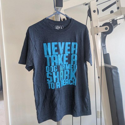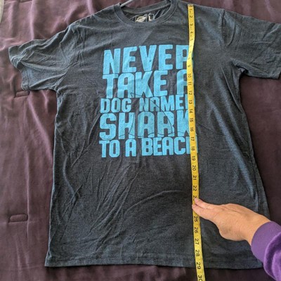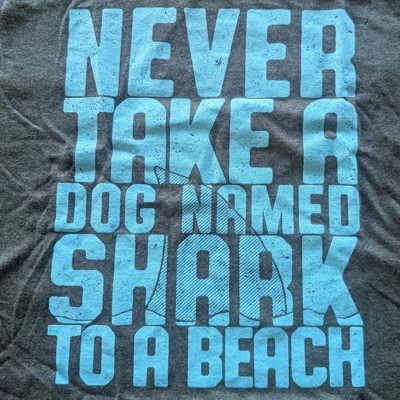 Shark and Dog Humor Design: Features the phrase “Never Take a Dog Named Shark to a Beach” in bold lettering; perfect for those who love clever jokes and animal-themed graphic tees; great conversation starter at summer hangouts or vacations