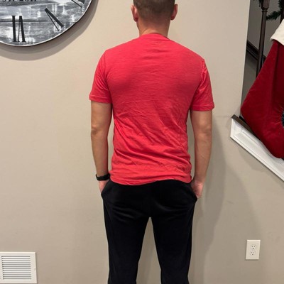 [This review was collected as part of a promotion.] This t-shirt is a size small and fit me true to size. I am about five feet seven inches tall and this was a great fit for me. The arm sleeves came to the middle of my bicep and were not tight. The material of the t-shirt was extremely soft and it was very comfortable. The neck collar was not tight either.