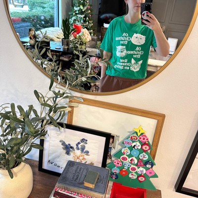 [This review was collected as part of a promotion.] this T-shirt is for starters very soft and comfy. I ordered a size large, which is intentionally oversized as someone who typically wears a medium or a small. It is a thinner T-shirt, material, but soft as opposed to structured or scratchy would be great for lounging, but in this case, I think perfect for holiday parties or just hanging out at home and celebrating , especially if you have a cat or understand what cats can do to a Christmas tree!