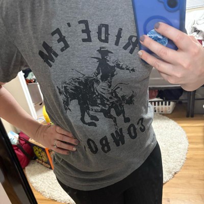 I had to rate this item as a one star because I did not receive the correct T-shirt. Instead of this Ride Em Cowboy shirt, I got a shirt with a deer (with night woods). I am not happy about this mistake as this item is a Christmas present for a nephew who likes cowboy stuff. I will be returning this wrong "deer" item and hope that I can get a cowboy shirt before Christmas.