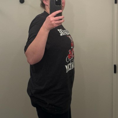 [This review was collected as part of a promotion.] Im a big feminist so this “sleigh the patriarchy” shirt made me giggle. But my kid thinks it looks like Santa is shooting spiderwebs like their favorite superhero and now I can’t unsee it. I wanted something loose and flowy so I ordered an XL. I’m 5’8” and I like the length. It fits the way I’d expect, so I’d say it’s true to size. It washes well but I’m not sure how long it will last. The material is really thin and you can see through it in the right light. Bottom line, it’s fun for a couple wears around the holidays but it’s too thin to make me think it would be in the regular rotation (assuming it didn’t have the Santa theme).