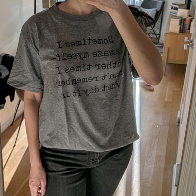 [This review was collected as part of a promotion.] This is advertised as a mens tee but there's really no gender limiting aspect to it. I am a competent person but I often don't know what day it is, that is genuinely my reality so pretty on point messaging for me. I bought it oversized for that slouched look cuz that suits the messaging. I've slightly tucked it in here with jeans but I could also wear it completely free-flowing with leggings. Very comfortable fabric and great value. If you do want to gift it to the man in your life, I think he'll find it hilarious but caution cuz then you'll also be giving him the excuse to never know what day it is! For reference, I'm 5'7, 140 lb and 34b wearing a size large here.