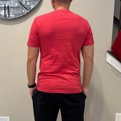 [This review was collected as part of a promotion.] This t-shirt is a size small and fit me true to size. I am about five feet seven inches tall and this fit well in the chest, arm and torso length. I was very happy with how soft and comfortable the t-shirt was. The neck and arms were not too tight which made this a great option for me this holiday season.