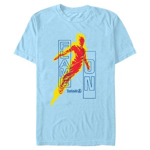 • Ready to turn up the heat? Flame on and stand out in this this chic men's t-shirt that is perfect for work, brunch, or battling cosmic threats! Featuring Johnny Storm fully flamed up as the Human Torch alongside his legendary line, "Flame On," and the official movie logo.
