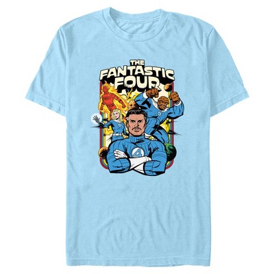 It's clobberin' time for your wardrobe! This officially licensed Men's Fantastic Four: First Steps Retro Family Graphic T-Shirt packs a punch with a comic book-inspired illustration of Mr. Fantastic, Invisible Woman, The Thing, and Human Torch leaping into action, all under the bold banner of "The Fantastic Four." This new Marvel apparel stretches, flames, and rocks its way into top-tier fashion. Don't stay invisible, ignite your look with a shirt that's scientifically cool and fantastically heroic!
