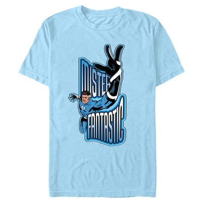 • Get ready to stretch the limits with this chic men's t-shirt that is perfect for work, brunch, or battling cosmic threats! Featuring a vibrant illustration of Mister Fantastic showing off his elastic powers, surrounded by retro shapes and stars, with the bold number "4" and his name in striking blue lettering.