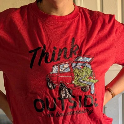 • Funny Quote Graphic Tee; Express your adventurous spirit with this ‘Think Outside – No Box Necessary’ t shirt; Ideal for men who love nature, road trips, and camping with vintage truck vibes and sarcastic humor