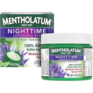 Mentholatum Nighttime Vaporizing Rub is a topical chest rub formulated with menthol, eucalyptus oil, and camphor to provide long-lasting relief from nasal congestion, cough, and minor muscle aches. Specially designed for nighttime use, this rub delivers a warming sensation and soothing vapors to help promote restful sleep while relieving cold and flu symptoms. Ideal for children and adults, this classic remedy brings comfort when you need it most.