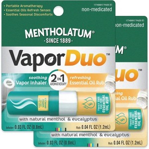 Experience dual-action relief with the Mentholatum Vapor Duo 2-in-1 Aromatherapy Stick. This innovative, portable stick offers two ends: one infused with menthol for clearing nasal passages and the other with calming essential oils like lavender and chamomile to help relax and soothe. Perfect for travel or everyday use, this aromatic solution provides on-the-go comfort for congestion, tension, or stress. Simply inhale through each end for a refreshing or calming experience wherever you are.