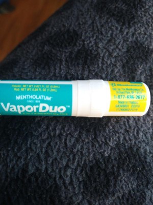[This review was collected as part of a promotion.] I have been so sick this season and this vapor duo has worked perfectly for me. This vapor inhaler helped cleared up my stopped up nose. The essential oil has a nice cooling effect that also helps. I plan to always have this product around.