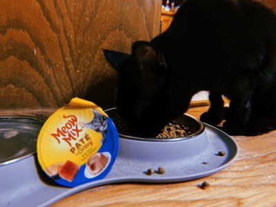 Our cats enjoy Meow Mix Surf n' Turf pate with gra
