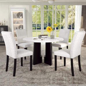 Transform your dining space with this 5-Piece Round Dining Table Set, designed to bring modern elegance and functionality to your home. The set includes a 43-inch round dining table with a sleek MDF tabletop and marble paper veneer, offering a sophisticated and authentic marble-like finish. Complementing the table, four upholstered dining chairs provide ultimate comfort and style. Each chair features an ergonomic curved backrest, high-resilience foam padding, and high-quality linen fabric for a chic, cozy dining experience. With sturdy solid rubber wood legs, this dining set promises both durability and beauty. Ideal for small to medium-sized spaces, this set combines clean lines, modern simplicity, and natural textures, making it a timeless addition to your home.