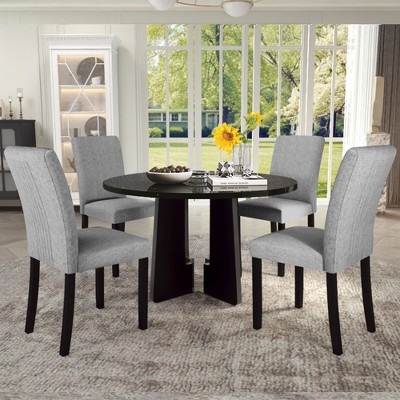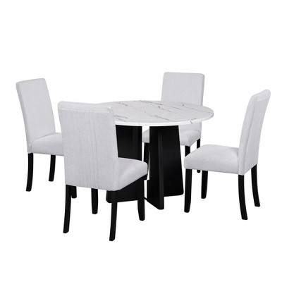 Transform your dining space with this 5-Piece Round Dining Table Set, designed to bring modern elegance and functionality to your home. The set includes a 43-inch round dining table with a sleek MDF tabletop and marble paper veneer, offering a sophisticated and authentic marble-like finish. Complementing the table, four upholstered dining chairs provide ultimate comfort and style. Each chair features an ergonomic curved backrest, high-resilience foam padding, and high-quality linen fabric for a chic, cozy dining experience. With sturdy solid rubber wood legs, this dining set promises both durability and beauty. Ideal for small to medium-sized spaces, this set combines clean lines, modern simplicity, and natural textures, making it a timeless addition to your home.