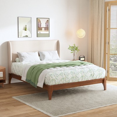 Merax King Size Solid Bamboo Platform Bed with Upholstered Double Wing Headboard