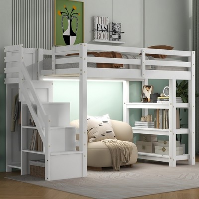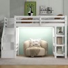 Maximize your space and create a stylish, organized room with this Twin Size Loft Bed. This modern loft bed includes built-in storage solutions like a three-layer shelf system, a storage staircase, and a small wardrobe with a clothes rack, all designed to help you keep your room tidy and functional. Under the loft, a white LED light provides ample illumination for reading, studying, or relaxing. Crafted with a sturdy pine wood frame and MDF panels for additional support, this loft bed is built to last while offering a sleek, space-saving design that makes the most of your vertical space.