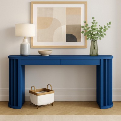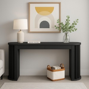 - [Elegant Oval-Edge Tabletop] The elongated 59-inch tabletop features gently rounded ends, offering a softer silhouette that contrasts beautifully with its structured legs. This spacious surface provides the perfect stage for decorative accents, lamps, or floral arrangements, instantly enhancing your home’s visual appeal.