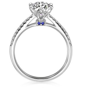 • Dainty Blue Accents: Adorned with small dark blue Cubic Zirconia stones on the sides, adding a unique touch and contrast to the dazzling clear solitaire.