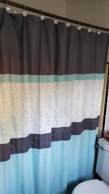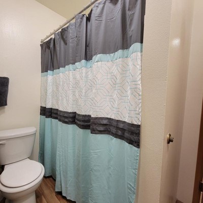 [This review was collected as part of a promotion.] The 510 Design Donnell Embroidered and Pieced Shower Curtain looks beautiful and fresh in my bathroom. It comes in a reusable clear bag. Has standard size, and fits great to my bathroom, length and width are great. The curtain has 12 holes for rings.. Material is microfiber, it is soft and sturdy. I love grey and aqua colors, and also embroidered geometric design. There is no shower curtain rings in the bag. I think it would be convenient to have them with the curtain in the bag, to refresh old rings. Overall I love the design and quality of this curtain. Great product to refresh the bathroom, I would recommend it.