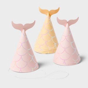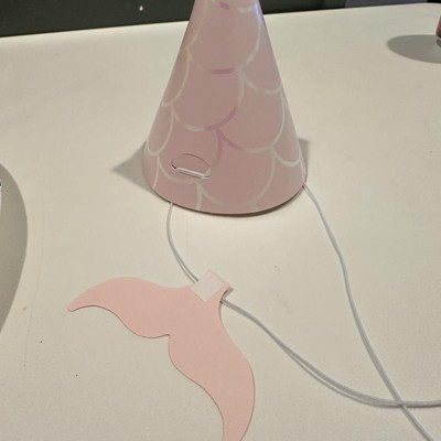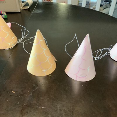 [This review was collected as part of a promotion.] We had a party for our granddaughter. We found these cute party hats. They were really versatile. You could use them as made in the cone shape or you could attach a small mermaid tails on them. The mermaid tail has a small adhesive to do so. There is a fun iridescent design of scales on the hat. They shimmers in the light. The hat has the regular stretchy string to keep the hat on. I received an incentive to write this review.