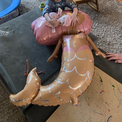 [This review was collected as part of a promotion.] This mermaid balloon is super cute and much larger than I expected. My toddler loves to carry it around the house. It was easy to inflate with the straw provided, taking only a couple of minutes. I’ve only had it inflated for 2 days, but it doesn’t appear to have lost any air. The price seemed a bit high, but it’s a large balloon. The colors of the balloon are very bright and vibrant, and it is perfect for any child who love mermaids. I received an incentive to write this review.