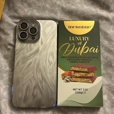 The Meronne Luxury of Dubai chocolate bar combines smooth, Dubai style chocolate, creamy tahini, pistachio cream and crispy kadayif to create a delicate, irresistible treat. Handcrafted with authentic ingredients, this 7oz pistachio chocolate bar balances sweet, nutty and crunchy textures for a truly indulgent bite. Each bite captures the richness of Middle Eastern confectionery. The Luxury of Dubai collection delivers authentic taste without preservatives or artificial colors. Elevate every occasion with Meronne Luxury of Dubai chocolate bars.