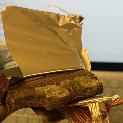 I ordered this online and it arrived partially crushed/opened, so I didn’t want to eat any of it. I’ll wait until I’m at the actual store to pick one up. It looked like it would be a good candy bar, though, especially if you like a thicker layer of chocolate around the filling.