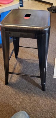 Give your home a modern upgrade with a rustic feel with this 24" tall backless metal dining stool. A lightweight, yet sturdy frame holds up to 500 lbs. and features cross bracing for added strength and durability, integrated footrest dining and floor glides to protect your flooring. A textured wooden seat adds a rustic vibe, making this versatile stool perfect for any aesthetic. Add to your kitchen island or dining for stylish, versatile seating. Additional Features: Stacks 4-8 High for Easy Storage, For Indoor Use Only, Item Size: 16"W x 16"D x 24"H; Seat Size: 12"W x 12"D x 24"H