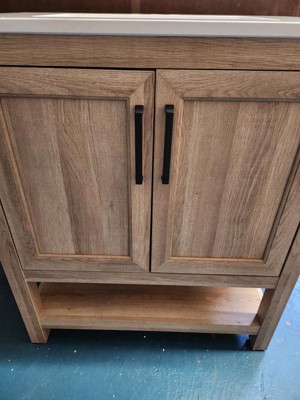 [This review was collected as part of a promotion.] This is an absolute beautiful vanity sink combo. I love that it comes preassembled and that all I had to do was switch the door pulls. It also contains a portion on the back that can be used as a splashguard. The marble is stunning and goes perfectly with my bathroom to me. The style looks a little farmhouse, but that’s exactly what I was looking for. Ample storage as well with space on the bottom for rolled up towels.