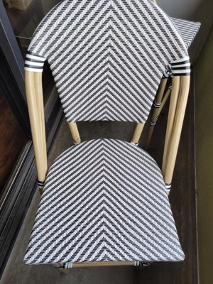 [This review was collected as part of a promotion.] The Noemi indoor or outdoor stackable french bistro bar stools are very nice and modern! The seat and back are black breathable textilene material with a bamboo print frame. They come in a set of two. These bar stools are very comfortable. They also seem to be very durable.