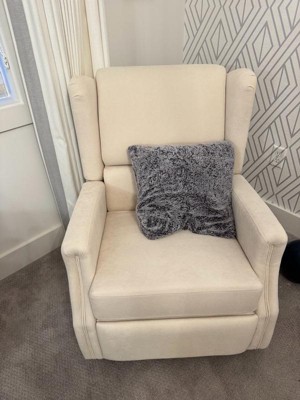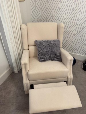 [This review was collected as part of a promotion.] Absolutely love this chair! The quality is so good — it’s extremely stable and the swivel & rock is really smooth. It’s reclined very far back, you’ll almost be laying horizontal! The material is a soft, low pile cream that I believe will make cleaning any stains a breeze. The chair was very easy to assemble. You screw in the wings (4 screws total) and then easily click in the back rest to the bottom and you’re done! I am so happy with this chair, it’s become my new favorite! I’m sure I’ll have this for years to come.