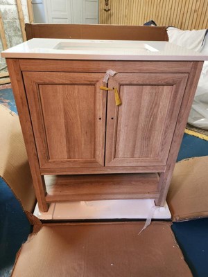 [This review was collected as part of a promotion.] Came well packaged with no damage. It was easy to install and had enough room for the plumbing. The inside has a good amount of space. My only wish was for a drawer instead of the open bottom but for a guest bathroom it works good and looks nice. It is on trend right now with the wood finish. The top is nicer than I thought it would be and there's plenty of room on the counter. The sink is a good size too. Overall I think this is really nice looking and perfect for a spare bathroom.