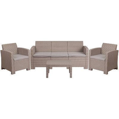 Merrick Lane 4 Piece Dark Gray Faux Rattan Patio Furniture Set with 2 Chairs and Sofa with Removable Light Gray Cushions and Table