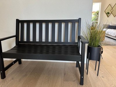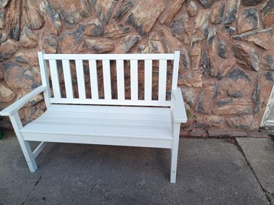 Enjoy the view from your front porch, sunroom, or backyard with this indoor/outdoor bench seat. Stunningly simple with a traditional slatted design and boasting a contoured seat and integrated armrests, this 2 person bench lets you relax in style. Heavy duty recycled HDPE resists UV fading and stands up to elements with no chipping, cracking, or peeling for year round use. Robust construction allows this bench to hold up to 300 lbs. static weight and assembly is quick and easy at under 30 minutes. Easily clean your new bench with a damp cloth and water based cleaner.