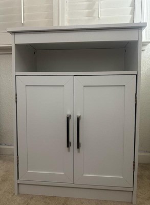 Extra storage is readily available in this freestanding storage cabinet designed for small spaces. The elevated, modern design allows this organizer to function in any room with ease. Constructed from premium materials, including sturdy engineered wood and premium metal handles and hinges, this space-saver features an adjustable in-cabinet shelf as well as an open upper storage or display shelf that holds up to 55 lbs. static weight and a magnetic closure doors. Setup takes under an hour and cleanup is easily achieved with a damp cloth.