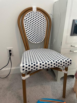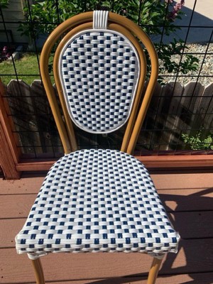 Merrick Lane Celia Stacking Thonet Bistro Style Chair, White & Navy PE Rattan Seat, and Bamboo Finished Metal Frame for Indoor/Outdoor Use