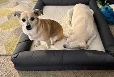 This bed is huge and comfortable, and my dogs love it! The order came fast and well packaged. The sleep surface is VERY soft, with a nice foam texture that is perfect for my senior lab mutt. My only complaint is that I purchased the largest size, which is supposed to be for dogs up to 44lbs. This bed is HUGE and would most likely work for the largest dog breeds. In the photos, the white dog is 49lbs, and the smaller brown dog is 18lbs, and they both fit on this bed with plenty of room to spare. It does take up a lot of space in my house, so I would recommend sizing down, as I think the medium would have been just fine for us.