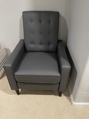 [This review was collected as part of a promotion.] This recliner looks great in my space and was very easy to put together. I love that it’s a more sleek and modern design – so much nicer than the usual bulky and old-fashioned recliners sold.The frame of this chair is slim so it fit in my space quite nicely. This chair is beautiful, well made, and sturdy!The leather is soft,sturdy & the tufted buttons add a nice touch. Overall, it’s really comfortable and reclines easily & farther back than I expected. I’m very happy with this chair! Would buy another from this same manufacturer again.