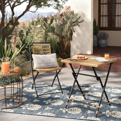 Elegance comes easy to this bistro set with a table and two chairs with woven PE rattan structures offering class in multiple color options to suit your style. The weather resistant metal frames feature a powder coated finish for a sleek look without the upkeep. The table supports up to 200 lbs. static weight and each chair supports up to 400 lbs. static weight. Floor glides ensure smooth movement and protect your hard flooring surfaces when used indoors. A tempered glass tabletop is perfect for serving your favorite meal or additional display space. Your table assembles easily in under ten minutes while the chairs arrive preassembled and the set wipes clean with a damp cloth.