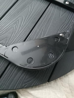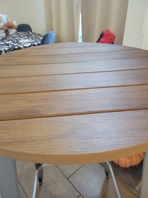 [This review was collected as part of a promotion.] This bar height table has a steel frame giving it a strong and sturdy feel. The slatted poly resin top provides a contemporary look. Adding a couple chairs provided a nice place on my patio to have snacks and drinks. Assembling this table took 10 minutes with the included tools. There are adjustable glides on each leg to provide a level and stable table.