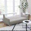 Captivating in its style while also offering a functional design, this mid-mod sofa futon is an achievement of ingenuity. Crafted with eye-catching qualities, this sofa futon features three relaxing recline options, upright, recline, and flat. The elegant faux linen upholstery is soft and durable while evoking a certain vintage appeal. Sinuous springs offer the ideal combination of comfort and durability, both for casual sitting and while laying. Foam fill cushions and stylish wooden legs that support up to 600 lbs. add to this sofa futon's multifunctional character