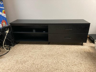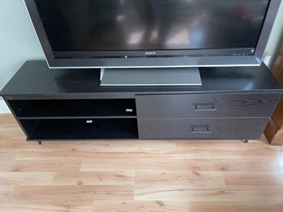 I am so happy with this purchase. I was looking for a low profile black TV stand, and this was the perfect piece. Assembly was less than 30 minutes for one person. The material is a good quality, and the color is a really warm black which I love! The drawers are smooth and spacious, and with the open shelving is a perfect blend. Buy it!