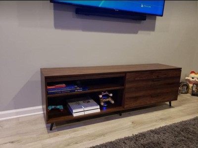 Retro style is coupled with 21st century functionality in this mid-century modern TV stand. Durably constructed with engineered wood, metal hardware, and steel brackets to provide support for up to 100 lbs. static weight. Ample storage is provided with stylish adjustable open shelving and two drawers. A cord management hole carved in the back helps to reduce visual clutter in your home. Assembles in less than one hour, and wipes clean with a damp cloth