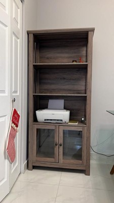 Old world charm meets modern functionality in this sleek farmhouse style storage cabinet bookcase. This stylish piece embraces the hustle and bustle of busy lifestyles with a lower storage cabinet boasting tempered glass doors and 3 tiers of open shelving that can handle up to 50 lbs. static weight per shelf. Display your plants, curated book collection, and more on this updated bookshelf featuring sleek metal accents that add an edgy flair, making it a standout piece in your living room or home office. Safety is a top priority so floor protector glides and anti-tipping hardware are included to secure your valuable belongings and prevent damage to your hard flooring surfaces.
