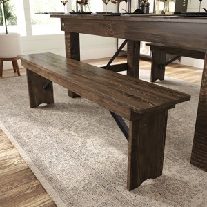 Bestow quaint, rustic beauty to your space with this farmhouse style folding bench in your mudroom, entryway, or hallway, or pair every decadent meal with elegant style by adding it to your dining room. Wow your guests by showcasing as-is or covering it with linens for more high-brow affairs. Durably constructed from solid pinewood, this bench seats three, holds 660 lbs. static weight, and can be utilized as a standalone piece or paired with a wood table. You will love the convenient, user-friendly design. The .78” thick legs pull out and lock by pushing in the security pins, then fold under the seat by removing the pins, saving space and facilitating quick and straightforward movement and storage. While intended for indoor use, this bench is safe to use outside during good weather. No product assembly is necessary with all hardware included. Maintenance is easy by cleaning with a dry cloth.